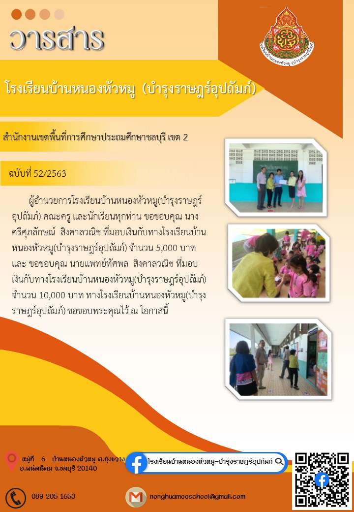 ขอขอบคุณ นางศรีศุภลักษณ์ สิงคาลวณิช นายแพทย์ทัศพล สิงคาลวณิช ที่มอบเงินกับทางโรงเรียนบ้านหนองหัวหมู(บำรุงราษฏร์อุปถัมภ์)